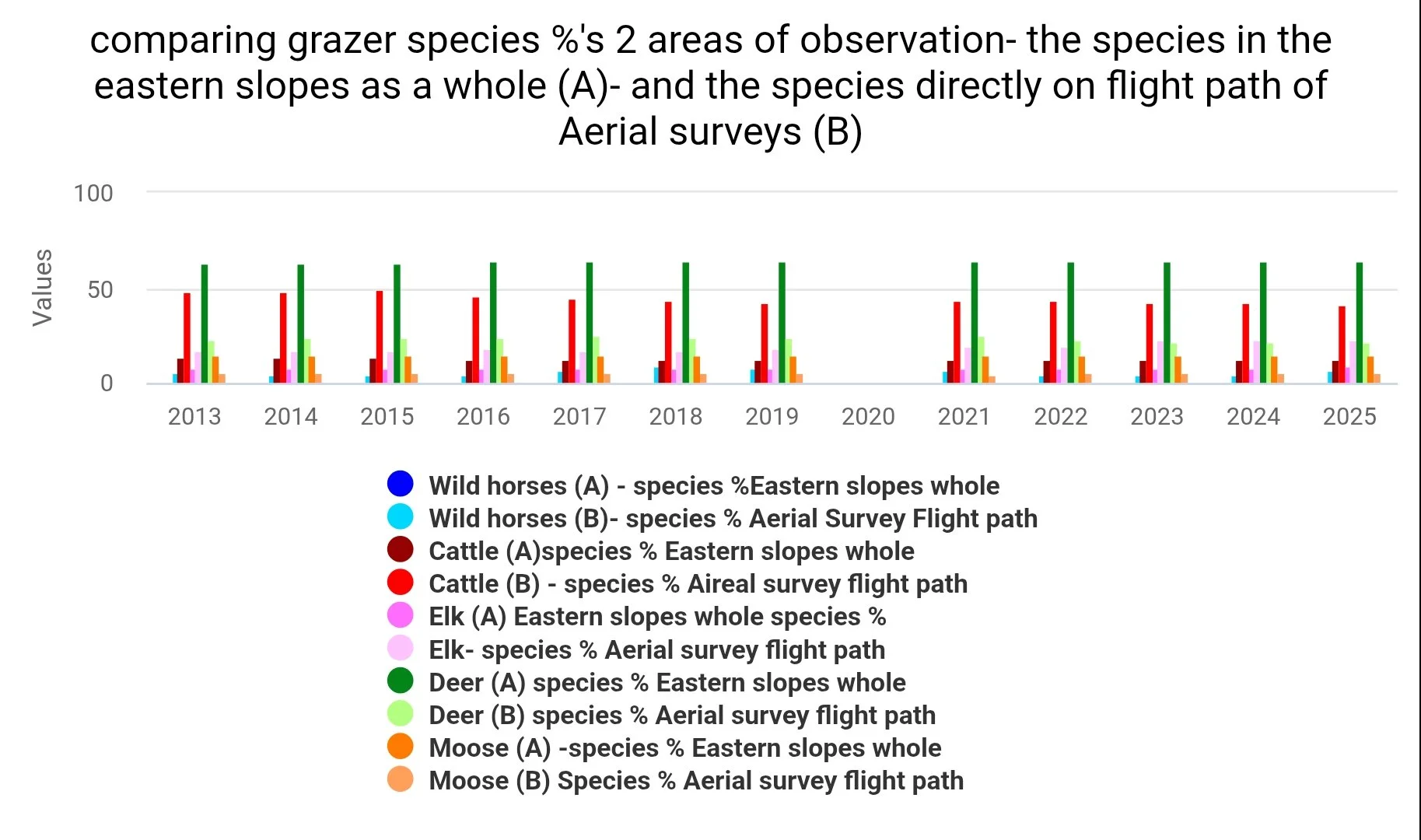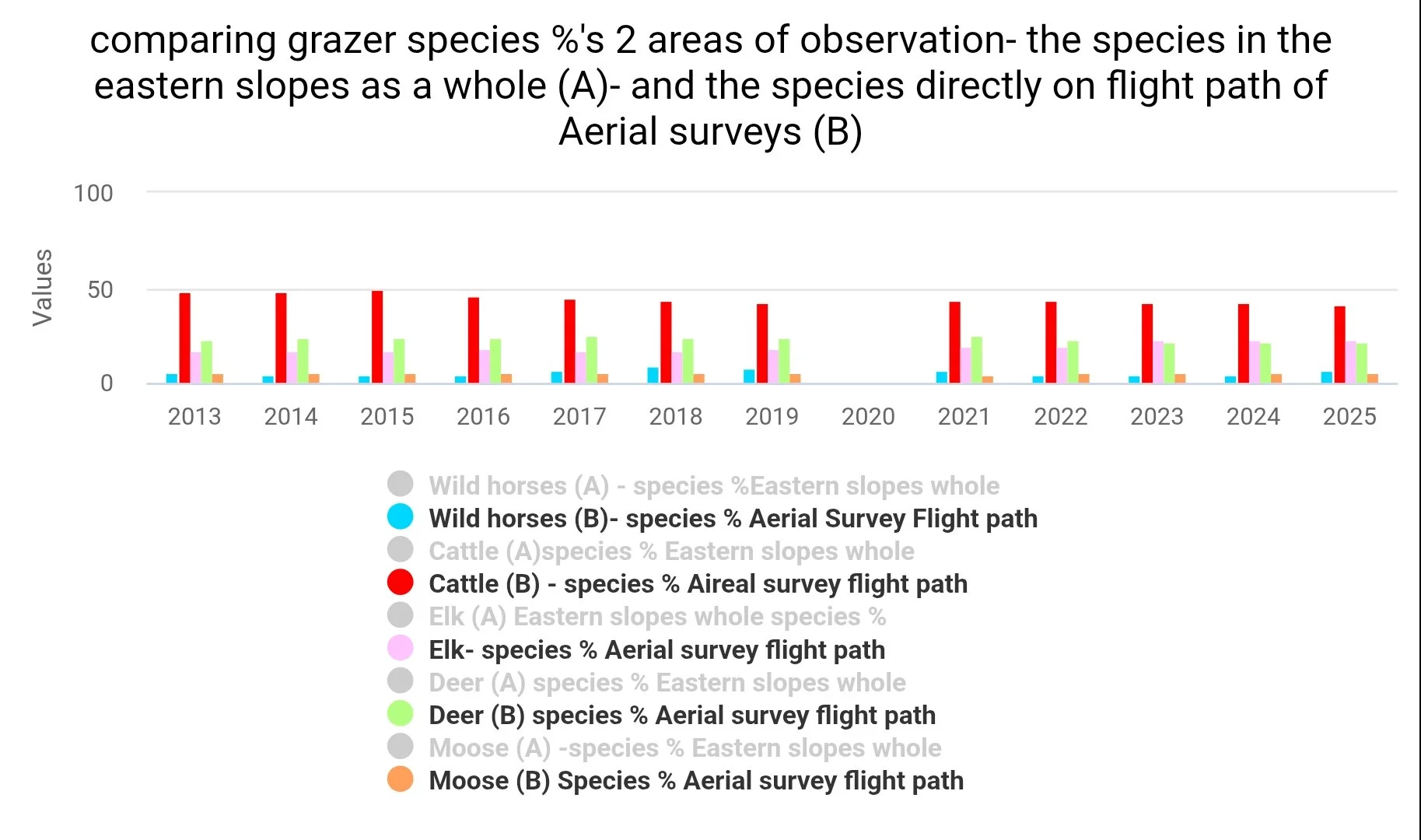 Wild horses are in the colour blue. Light blue (what you see on the graph) is specifically over the zones they survey. Being wild horse centered surveys, they are actively seeking wild horses and may not be searching for or documenting the other species present. While the dark blue is almost nonexistent existent when looking at the eastern slopes as a whole, the wild horses go almost undocumentable.