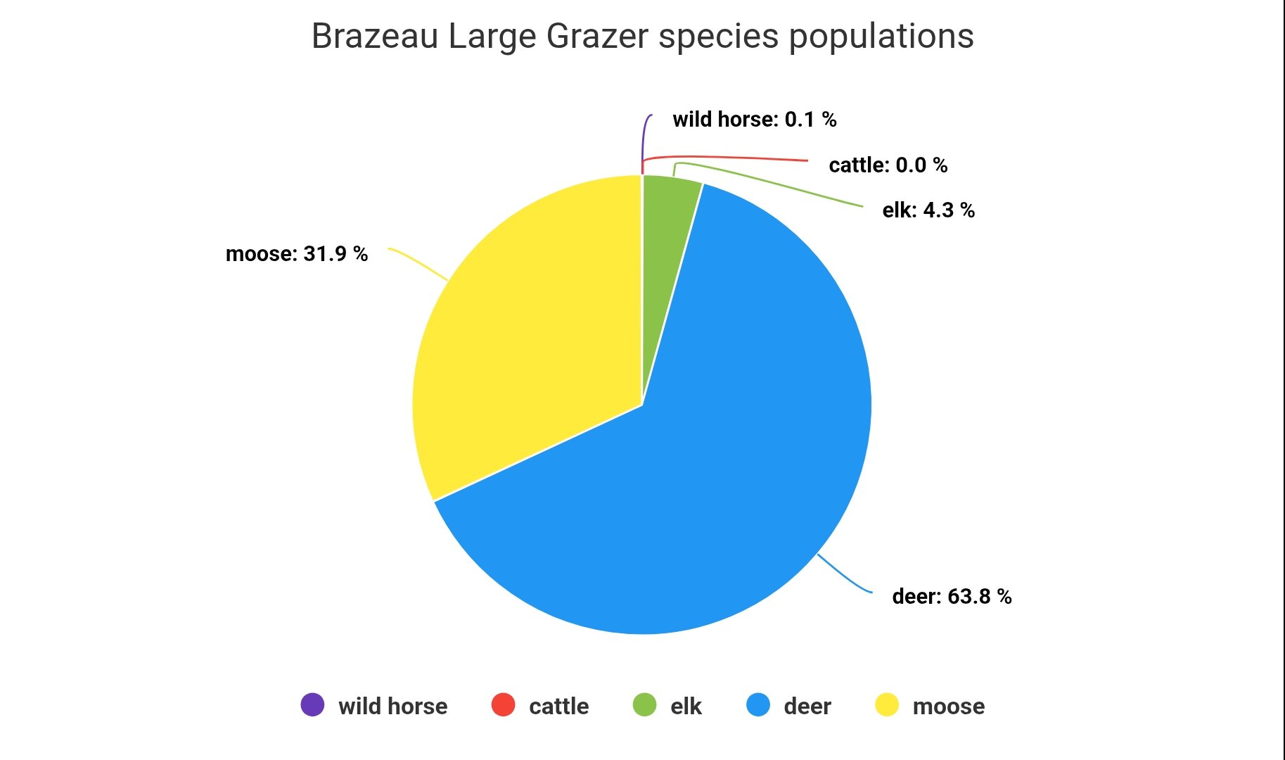 And finally for Brazeau- the wild horses. We can see the population at 0.1% meaning the wild horses do not even make up 1% of the population, statistically their numbers are so low it is closer to 0% that 1% of the total large grazing species in Brazeau. So while the cattle are certainly not to blame here in Brazeau, neither are the wild horses. If over grazing is occurring in Brazeau, the moose and deer populations should be the first looked as the culprits here.